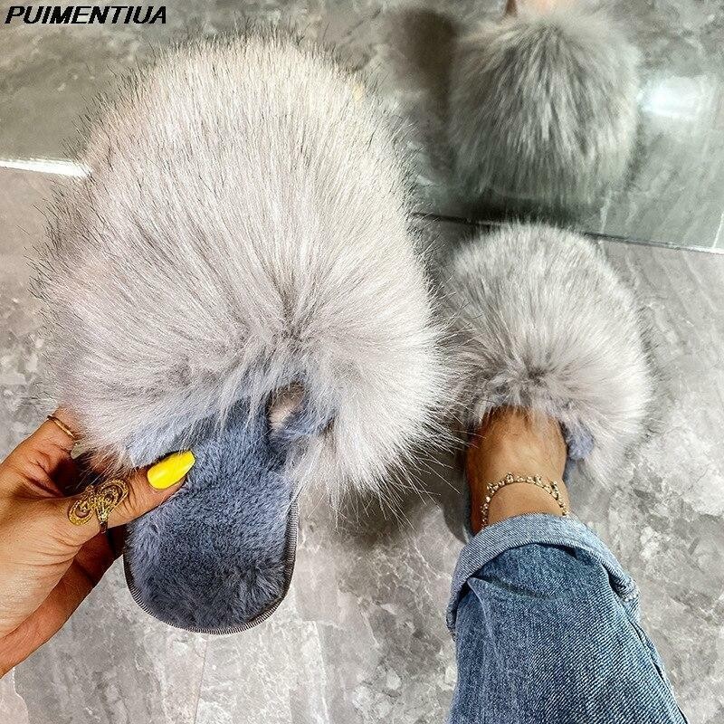 Fur Slides Women Summer Furry Slippers Fluffy Home Shoes Ladies Luxury Fur Flops