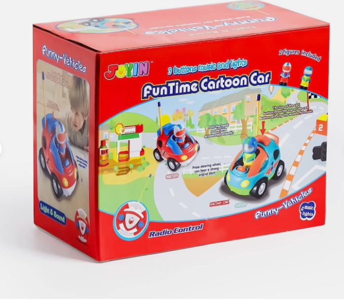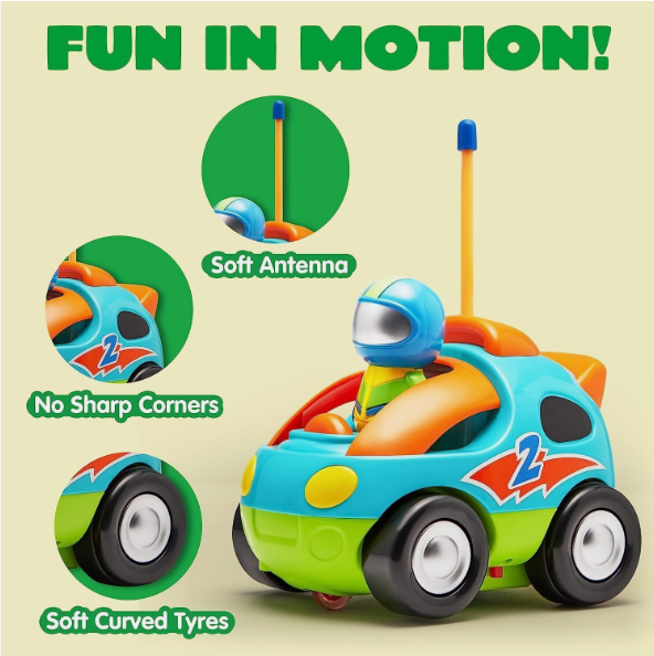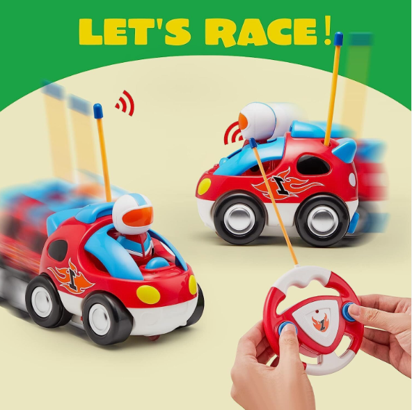 Race Car Radio Control Toddler Cars Includes 2 Cartoon Radio Control Race Cars with Music and Sound Features, 2 Different Removable Action Figures and 2 Remote Controls with Forward and Reverse Left Channels.